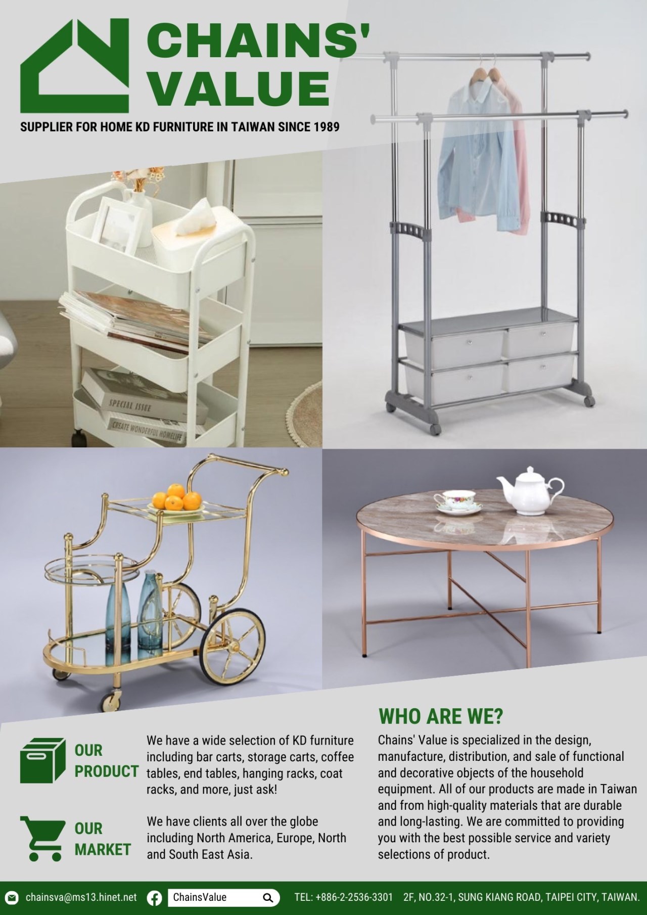 Established in 1989, Chains’ Value Co., Ltd. is focus on exporting of storage items, clothes hanging rack, bar carts, k/d furniture for over 30 years.